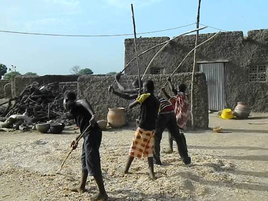 Je me suis limité à leur donner des leçons sur comment les coups des bâtons doivent produire ce rythme, sinon, ceux qui l’ont pratiqué comme moi avant de rejoindre les villes, savent que les coups de bâtons sont également accompagnés de chansons traditionnelles agréables. Ces chansons sont chantées par les jeunes en même temps qu’ils battent le mil. Ces chants sont plein de sens. Ils servaient encourager, taquiner, à conseiller les jeunes…